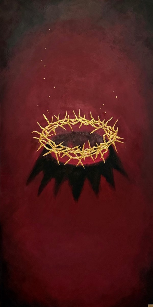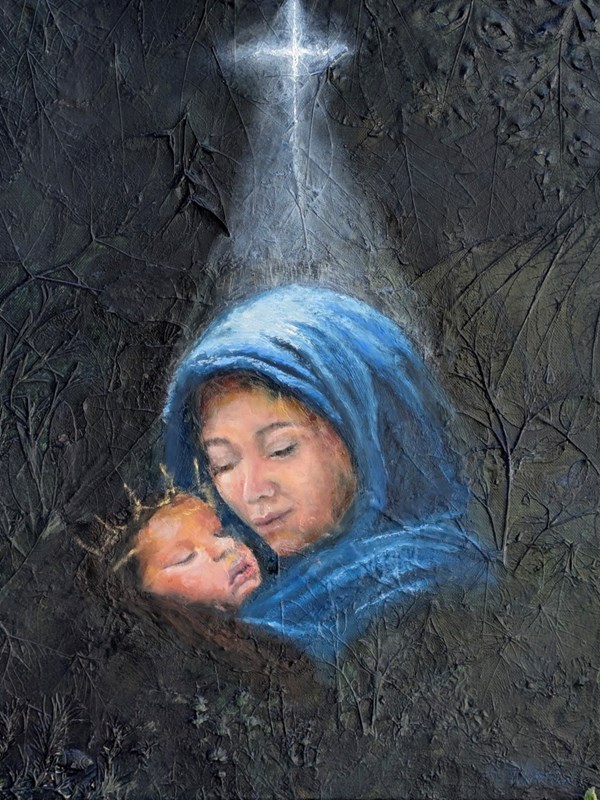 In this painting, Mother and Child rest within a garden – an echo of Eden. The garden sits in the background, dark and unreachable due to sin and exile. The star foretells the holy child’s death and celebrates his resurrection with the emptiness of the cross and the light of victory over sin and death. The garden, once distant, is no longer a story of separation but a promise offered to all who will receive the Christ. Through gentle light, intimate presence, and quiet reverence, this work invites viewers to contemplate redemption’s miracle of divine grace and what was once closed has been opened by love.