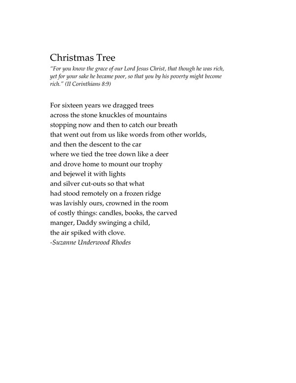 This poem looks back to an earlier time of my life and a beautiful family memory of going into the mountains of southwest Virginia where fir and pine trees were available for a small cost if you cut it down yourself. We would all pile into the car and drive for nearly two hours, with the last several miles taking us on ice mountain roads – usually it was night by the time we got there. It took a while to find the perfect tree, but when we all agreed, my husband cut it down with a chainsaw and tied it to the roof of the car.